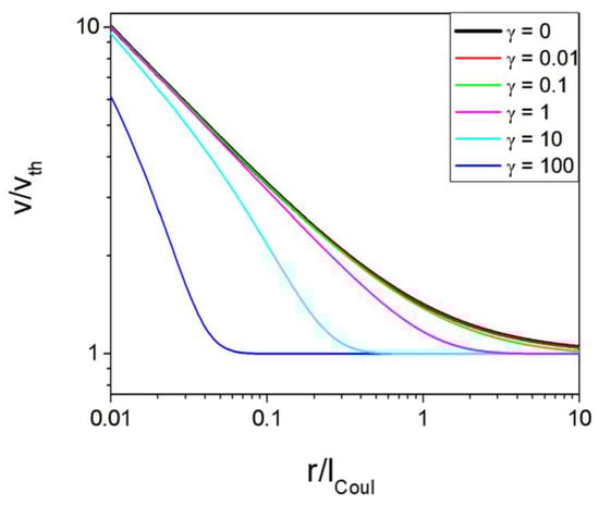 The data shown in Figure 1 indicate that the velocity may be accelerated in a drastically different manner. Nevertheless, several general features can be distinguished. First, the noticeable acceleration emerges at distances not larger than several Coulomb lengths. Second, the screening is extremely important; for a screening length that is close to the Coulomb length, the acceleration could be neglected at distances greater than the Coulomb length. Finally, at very close distances, the acceleration may increase the carrier velocity by one order of magnitude.