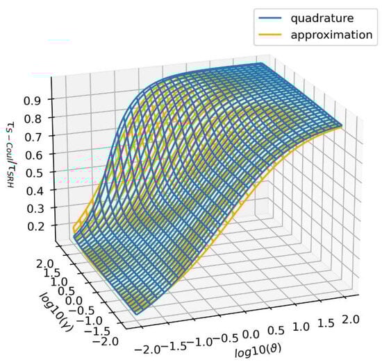 The relative capture time () calculated by Formula (10) by a numerical quadrature and by Approximation (16).