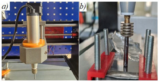 To maintain consistency in the deposition conditions, we utilized a CNC 3018 Pro computer numerical control system with a working surface measuring 300 × 180 × 40 mm. The axis was equipped with Nema 17 brushless motors (Figure 1). Woodpecker control was performed using LaserGRBL software (https://lasergrbl.com/, accessed on 15 September 2024) to create a 20 × 20 mm square field with lines that filled the space in a vertical and horizontal pattern.