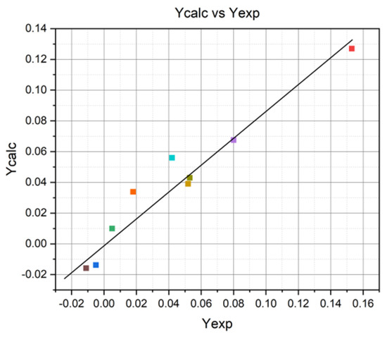 The model’s precision can be evaluated utilizing a diagnostic diagram of calculated versus experimental values [29]. Figure 2 illustrates the plot of predicted versus experimental values. All experimental data points are situated in proximity to the straight line, indicating the consistency of a normal distribution. A strong correlation between the calculated and experimental values for the response function substantiates the adequacy of the proposed model. An analysis of the calculated and tabulated values of the Fisher criterion highlights that the choice to adopt second-order orthogonal compositional central programming as the method of designing the experiment was correct, and the equation of the calculated model expresses, with maximum probability, the dependence between the two groups of parameters (independent and dependent, respectively). A graphical representation of this equation is presented in Figure 3.