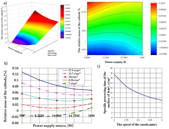 - The most significant relative mass increase of the cathode corresponds to the lowest power of the power source (5 W in this case) associated with the longest specific processing time of the cathode (the lowest anode traversal velocity over the cathode surface), which increases the probability of redeposition of any detachment from the cathode surface along with the polar transfer and deposition of the products resulting from anodic erosion.