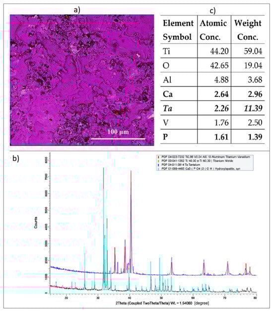 Analysis utilizing the EDAX method (Figure 5) revealed that the titanium alloy comprised approximately 2.96% calcium, 1.39% phosphorus (highlighted in Figure 5c), and 11.39% tantalum (Figure 5c—added from the electrode material) in combination with the elements of the titanium alloy. The experiments were conducted under the following conditions: (one layer—the adhesion layer; processed surface 4.0 cm2 p = 5 W).