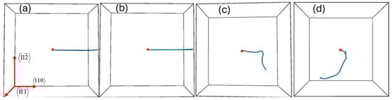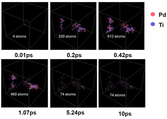 Figure 5 shows the trajectories of primary knock-on atoms (PKAs) in different PdTi alloys at 600 K under a PKA atom incident energy of 20 keV. The images depict the movement of the PKA atoms in the four different alloy compositions: (a) PdTi, (b) PdTi1.5, (c) PdTi, and (d) Pd1.5Ti. In the PdTi alloy (a), the trajectory of the PKA atom appears relatively straight and covers a considerable distance. This indicates that the PKA atom moves through the lattice with minimal deflection, suggesting that the lattice provides less resistance to the PKA atom’s motion. This could imply relatively fewer interactions with surrounding atoms, leading to fewer collisions and, thus, less energy dissipation. In the PdTi1.5 alloy (b), the PKA atom’s trajectory is also relatively straight and similar to that in pure Pd. This suggests that the PKA atom encounters a similar level of resistance in PdTi1.5 as in pure Pd, resulting in comparable energy dissipation. The trajectory shown for PdTi (c) indicates more deflection and the shortest path among the alloys. This suggests a higher degree of interaction between the PKA atom and the surrounding lattice atoms, leading to more collisions and energy dissipation. The increased deflection implies that the PKA atom loses energy more quickly, resulting in a shorter overall trajectory. The PKA atom in Pd1.5Ti (d) exhibits a curved trajectory with a short path. This indicates a high level of interaction with the lattice atoms, leading to multiple collisions and substantial energy dissipation. Although the path is slightly longer than that in PdTi (c), it still shows significant energy dissipation. Overall, the trajectories of the PKA atoms in pure Pd and PdTi1.5 alloys are similar, indicating comparable levels of energy dissipation and obstruction. The PdTi alloy shows the shortest and most deflected trajectory, indicating the highest energy dissipation and strongest interaction with the lattice [56,58]. The Pd1.5Ti alloy’s trajectory is similar to PdTi, showing high interaction and significant energy dissipation.