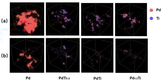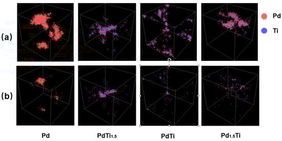 Figure 4 presents the distribution of the point defects at the peak of the cascade collisions and the stabilized distribution of the point defects after 10 ps of recombination under a system temperature of 600 K and with a PKA atom incident energy of 30 keV for Pd, PdTi1.5, PdTi, and Pd1.5Ti. Figure 3a depicts the scenario at the peak of the cascade collisions, and the bottom row (b) illustrates the scenario after 10 ps of irradiation. At the peak of the cascade collisions under 30 keV irradiation (Figure 4a), the point defects increase significantly across all alloys compared to the 20 keV scenario. For pure Pd, the point defects are even more widespread, with deeper penetration and multiple secondary cascade clusters, indicating continued minimal obstruction, which is similar to the trend observed in the results for Ni in the referenced literature [56,57]. In the PdTi1.5 alloy, the depth and size of the point-defect distribution are still reduced, but secondary cascade clusters persist. In the PdTi alloy, the point defects are further reduced, with no secondary cascade clusters, indicating significant obstruction of the cascade collision. The Pd1.5Ti alloy shows a similar pattern to PdTi, suggesting that increasing Pd content does not improve irradiation resistance further, likely due to the reduced entropy.