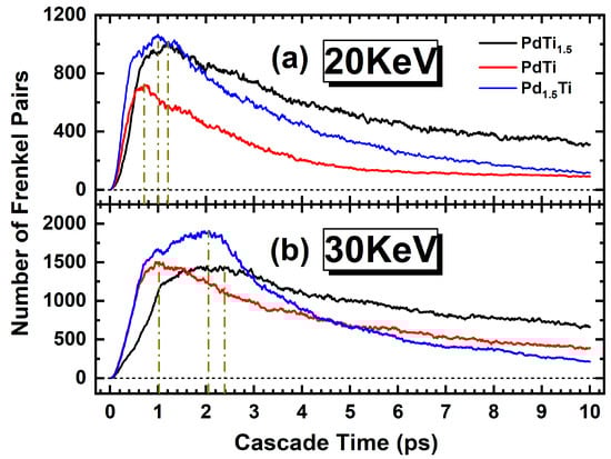 In both panels, the evolution of Frenkel pairs indicates that the PdTi1.5 alloy consistently exhibits the highest number of defects, followed by the Pd1.5Ti alloy, with the PdTi alloy showing the lowest number of defects. Additionally, a noticeable shift in the peak position is observed, suggesting that the peak time varies with the alloy composition and initial energy, thereby underscoring the significant influence of both factors on the defect dynamics in these alloys [59].