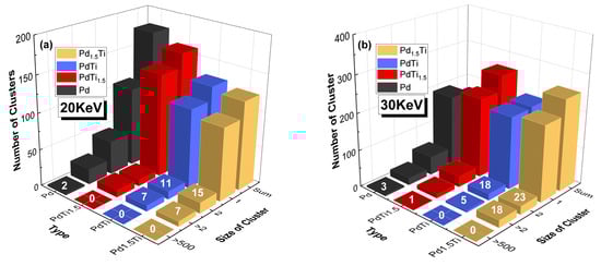 Figure 9 presents a comparison of the number of interstitial atoms (occupancy = 2) and vacancy atoms (occupancy = 0) in different cluster sizes for Pd, PdTi1.5, PdTi, and Pd1.5Ti alloys at 600 K with incident PKA energies of (a) 20 keV and (b) 30 keV. It is observed that the defect clusters in these alloys predominantly exist in the form of single defects, with only a small number of clusters forming with sizes of 2, 3–500, and greater than 500. The number of clusters with sizes of 2, 3–500, and greater than 500 increases with the incident energy. PdTi exhibits the least formation of larger clusters. Furthermore, interstitial atoms are more likely to aggregate and form clusters in the size range of 3–10, whereas vacancy defects are less likely to form clusters. Studies indicate that vacancies are less mobile than interstitials because the atoms around a vacancy in a crystal form a binding effect that restricts the movement of the vacancy. As the number of defects increases, their mobility decreases, making vacancy clusters more prone to being confined by surrounding atoms and thus forming smaller clusters. In contrast, the atoms around interstitial defects are more loosely arranged, allowing interstitials to move more easily. Therefore, individual vacancies are more likely to form smaller clusters.