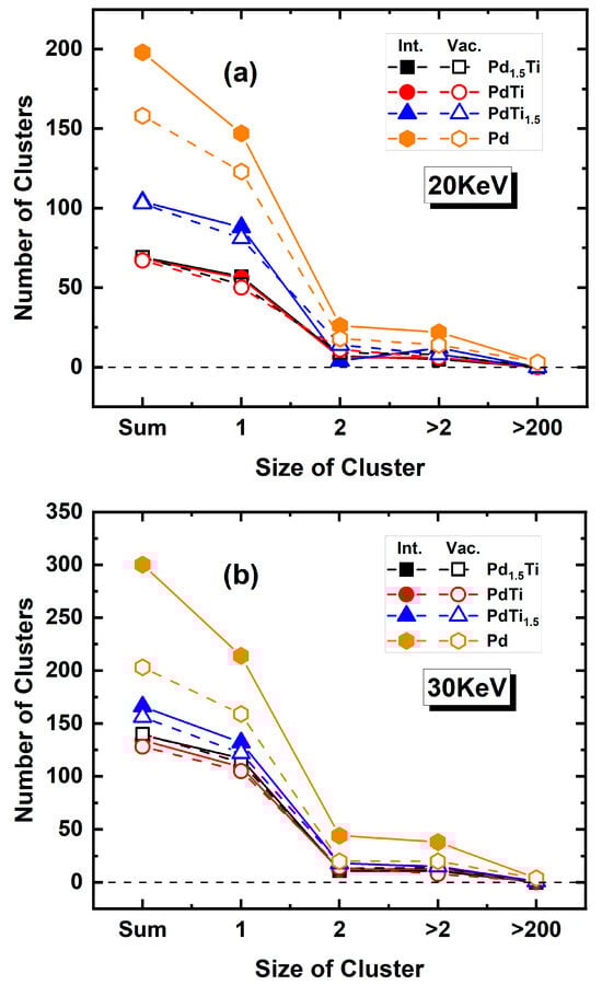 Comparison of the number of interstitial atoms (occupancy = 2) and vacancy atoms (occupancy = 0) in different cluster sizes for Pd, PdTi1.5, PdTi, and Pd1.5Ti alloys at 600 K with incident PKA energies of (a) 20 keV and (b) 30 keV. Hollow symbols and solid lines represent the number of interstitial atoms of the corresponding size, while filled symbols and dashed lines represent the number of vacancy atoms of the corresponding size.