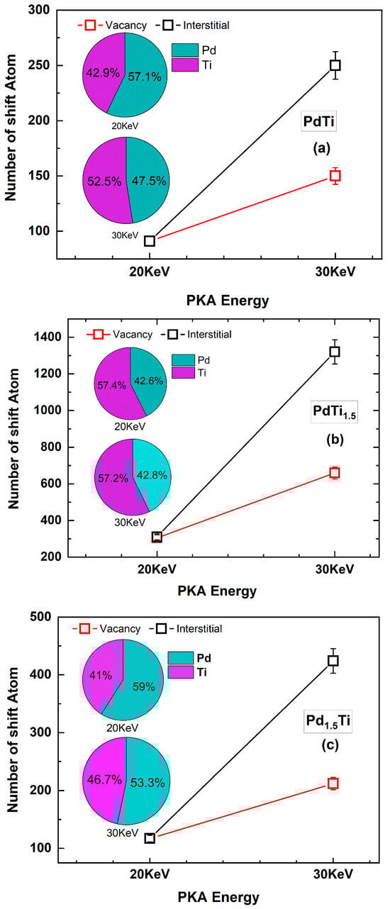 Therefore, we found that when irradiating the PdTi alloy at PKA energies of 20 keV and below, the irradiation resistance of the alloy gradually enhances with the increase in entropy. As the PKA energy increases to 30 keV, the Pd component in the PdTi alloy demonstrates its stability, while the Ti atoms in the PdTi alloy are more likely to be irradiated into interstitial atoms.