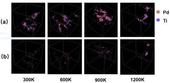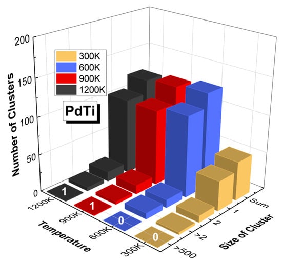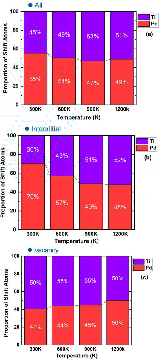 Figure 16 shows the proportion of Pd and Ti elements in PdTi after 10 ps of recombination at different temperatures (300 K, 600 K, 900 K, and 1200 K), where (a) shows the proportion of Pd and Ti in clusters composed of all atoms, (b) shows the proportion of Pd and Ti in clusters composed of interstitial atoms, and (c) shows the proportion of Pd and Ti in clusters composed of vacancy atoms. Observing Figure 16a, it is evident that as the temperature increases from 300 K to 600 K and then to 900 K, the proportion of Ti in the clusters gradually rises. However, as the temperature increases from 900 K to 1200 K, the proportion of Pd becomes dominant. The overall trend in Figure 13b, showing the proportion of Pd and Ti in clusters composed of interstitial atoms, is similar to that in Figure 16a for clusters composed of all atoms. From Figure 14, we conclude that the effect of temperature on PdTi’s resistance to irradiation damage is primarily due to the increased number of vacancy atoms. By observing Figure 16c, it is clear that as the temperature rises, the proportion of Pd in the clusters composed of vacancy atoms consistently increases, indicating that higher temperatures may promote the formation of more Pd vacancies.