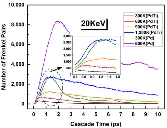 Figure 12 shows the number of Frenkel pairs as a function of cascade time in Pd and PdTi at different temperatures with a PKA energy of 20 keV. The main plot illustrates the evolution of Frenkel pairs over a period of 10 ps, with each curve representing a different temperature: 300 K, 600 K, 900 K, and 1200 K for PdTi, and 300 K and 600 K for Pd. The inset zooms in on the peak of Frenkel pairs within the initial stage of the cascade. The green and purple lines represent the evolution of Frenkel pairs in Pd at 300 K and 600 K, respectively. From the graph, it is evident that the cascade collision peak and the number of Frenkel pairs after 10 ps of recombination in Pd at 600 K are significantly higher than those in PdTi. This indicates that an increase in temperature has a significantly detrimental effect on the irradiation resistance of Pd. In contrast, PdTi shows lower numbers of Frenkel pairs both at the cascade collision peak and after 10 ps of recombination at 300 K, 600 K, and 900 K. However, when the temperature increases to 1200 K, there is a significant increase in the cascade collision peak and the number of Frenkel pairs after 10 ps of recombination in PdTi [32].