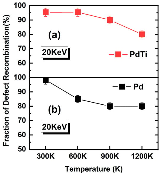 After understanding the images of alloy irradiation at different temperatures, both at the peak of the cascade collisions and after 10 ps of recombination, we proceed to further calculate the defect recombination rate. Figure 13 shows the defect recombination fraction curves for PdTi and Pd at different temperatures (300 K, 600 K, 900 K, and 1200 K) with an incident PKA energy of 20 keV. From the figure, it can be observed that as the temperature increases, the recombination rate for PdTi (a) initially remains high but starts to decrease slightly when the temperature reaches 900 K and continues to decline at 1200 K. In contrast, the recombination rate for Pd (b) shows a significant decline as the temperature rises from 300 K to 1200 K. This indicates that before reaching a certain temperature threshold, the temperature has little effect on the recombination rate of PdTi. However, beyond this threshold, the recombination rate decreases significantly. Compared to pure Pd, PdTi exhibits a significantly higher recombination rate, likely due to the higher entropy of the medium-entropy alloy PdTi compared to pure Pd.