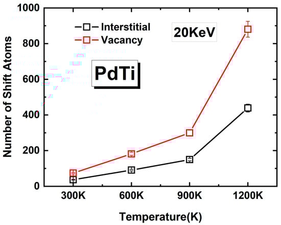 Figure 14 shows the number of shift atoms in PdTi after irradiation at different temperatures (300 K, 600 K, 900 K, and 1200 K) with an incident PKA energy of 20 keV. These shift atoms refer to atoms occupying non-regular lattice sites. The graph distinguishes between interstitial atoms (black squares) and vacancy atoms (red squares) in the clusters. From the figure, it is evident that both the numbers of interstitial atoms and vacancy atoms increase with temperature. At 300 K, the numbers of interstitial and vacancy atoms are relatively low. As the temperature increases to 600 K, the numbers of both types of shift atoms increase slightly. At 900 K, the number of vacancy atoms increases significantly compared to interstitial atoms, indicating that higher temperatures favor the formation of vacancies. At 1200 K, there is a sharp increase in the numbers of both interstitial and vacancy atoms, with the increase in vacancies being particularly pronounced. Overall, the data suggest that the effect of temperature on PdTi’s resistance to irradiation damage is primarily due to the increased number of vacancy atoms. While PdTi maintains a relatively stable defect structure at temperatures up to 900 K, at 1200 K, the number of defects, especially vacancies, increases significantly, which could lead to a considerable weakening of PdTi’s irradiation resistance. The data indicate that PdTi may retain good irradiation resistance at temperatures up to 900 K.