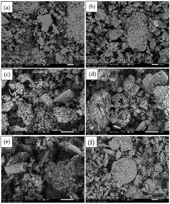 Morphology of diatomite particles: (a) 0 ÷ 0.063 mm without thermal treatment; (b) 0 ÷ 0.063 mm after thermal treatment; (c) 0.5 ÷ 3 mm without thermal treatment; (d) 0.5 ÷ 3 mm after thermal treatment; (e) 2 ÷ 5 mm without thermal treatment; (f) 2 ÷ 5 mm after thermal treatment.