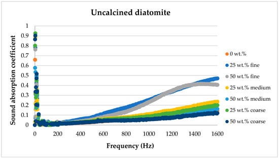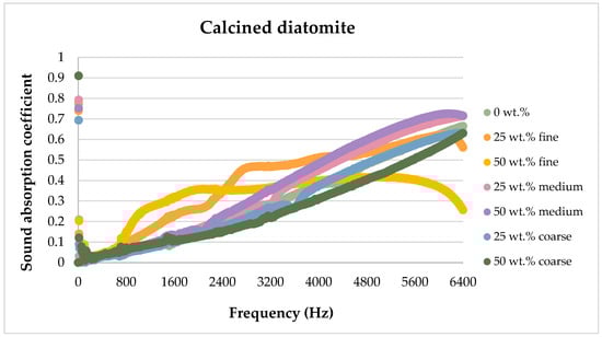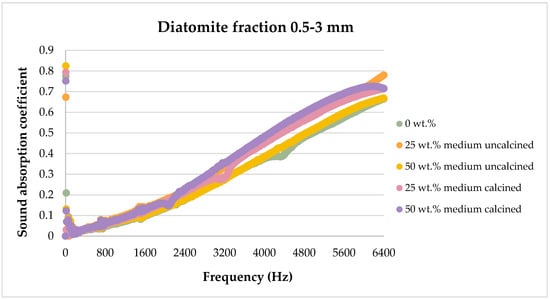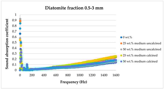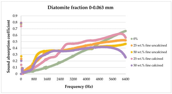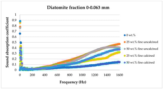 Comparing different fractions of diatomite and their different shares, for calcined diatomite, it can be concluded that in the frequency range of 50–1600 Hz, the 25 wt.% and 50 wt.% of diatomite addition in the form of 0–0.063 mm fine dust is the most favorable. The use of diatomite with larger fractions affects the sound absorption capacity to a lesser extent and may even negatively affect this parameter. The use of a 50 wt.% diatomite additive with a fraction of 2–5 mm causes a deterioration of the composite’s sound attenuation ability compared to the material without the introduction of diatomite.