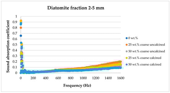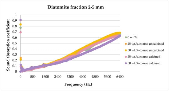 The addition of diatomite with a particle size of 2–5 mm has little effect on the sound absorption coefficient of the composites. As in the case of smaller fractions, the 25 wt.% diatomite addition also has the most favorable effect.
