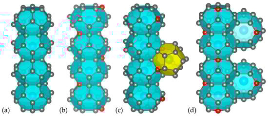 The preparation of all structural models for the DFT calculations as well as the illustration of the crystal structures and the electron localization function plots (see Section 2.3) was performed using the version 3.9 VESTA software [26]. For Cs8Sn46−x, the experimentally determined structure for Cs8Sn44 at room temperature from synchrotron diffraction data [21] was used as starting point. Symmetry reduction from space group Ia-3d (No. 230) to space group P1 (No. 1) was performed to avoid any underoccupied Sn sites and the following four models were studied: (a) Cs8Sn46 with no defects, where the atomic coordinates are equal to the type-I clathrate archetype symmetry (space group Pm-3n, No. 223), (b) Cs8Sn44 model A, where the defect sites are located in neighboring six-membered Sn rings (4 Sn atoms in between) and form a non-crystallographic helical axis (similar to 21) across the tkad chains in one of the three crystal axes (there are only half the defect sites in the other two crystal axes), (c) Cs8Sn44 model B, where the defect sites are located in five-membered rings (two Sn atoms in between) of both pdod and tkad in one of the three crystal axes, and (d) Cs8Sn44 model C, where the defects are located in six-membered Sn rings of the tkad (three Sn atoms in between) without forming a helical axis as in model A, but forming a spiro-network between interconnected tkad in all three crystal axes (Figure 2).