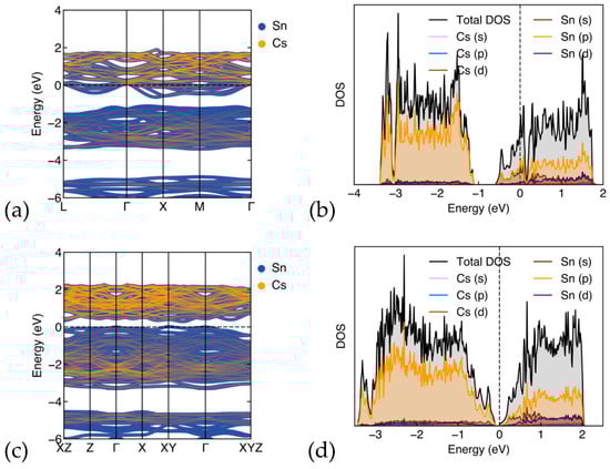 We have calculated the band structures and DOS of the optimized Cs8Sn46 and C8Sn44 (model C) (Figure 4). In Figure 4a, the band-structure of Cs8Sn46 is shown, plotted along the k point path of L(0.5,0.5,0.5), Γ(0,0,0), Χ(0.5,0,0), Μ(0.5,0.5,0), and Γ. The metallic structure of Cs8Sn46 is evident as the Fermi level (dashed line) is in the conduction band, which is in alignment with previous studies [12]. The partial density of states (Figure 4b) of Cs8Sn46 illustrates the contribution of each element to the total DOS. The total DOS is dominated by the Sn atoms, while the contribution of Cs atoms is significantly smaller. Both atoms contribute with the p orbitals above and below the pseudo-gap, while the d orbitals of Cs are more prominent above the pseudo-gap. There are few overlapping peaks between Cs and Sn, with some small peaks just above the Fermi level and deep in the valence band around −3 eV. This indicates minimal hybridization between Cs and Sn orbitals, suggesting that the Cs-Sn bond is not strongly covalent, leaning more towards an ionic character. The Cs atoms can act as electron donors, contributing to the conductivity, which is also evident from the Cs contribution in the band structure (Figure 4a).
