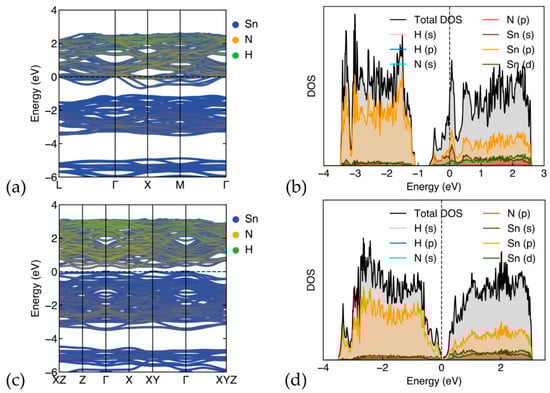 In Figure 5, the band structure and density-of-states of (ΝH4)8Sn46−x (x = 0,2) are shown. In Figure 5a, the calculated band structure of (ΝH4)8Sn46 is presented. As in the case with Cs guest atoms, the band structure reveals a metallic character, with the Fermi energy level situated in the conduction band. In Figure 5b, the total and partial DOS are shown for this structure. We observe a similar picture to that of the Cs8Sn46 structure, mainly in the sense the DOS is dominated by framework atoms, with the Sn (p) orbitals being the most prominent, while the guest atoms, N and H, contribute less than 2% of the total DOS. Both nitrogen s and p states show small and almost equal contributions, with a peak at the Fermi level. Hydrogen s and p states display minor contributions and are more prominent in the conduction band region. The are no significant overlapping peaks in the PDOS for Sn and N or H below the Fermi level, except for the peaks at 3 eV below the Fermi level and a peak at the Fermi level. When examining the band structure of (ΝH4)8Sn44, we observe semiconducting behavior with a small band gap of approx. 0.18 eV and the Fermi level at the top of the valence band. Similar to the case of Cs8Sn44, this material is an indirect band gap, where the valence band maximum and the conduction band minimum appears at XY and Z, respectively. The DOS of (ΝH4)8Sn44 are shown in Figure 5d. In comparison with the DOS of (ΝH4)8Sn46, we observe a flatter image with less prominent peaks. As in the case of Cs8Sn46−x, we observe a non-covalent character for guest–host interactions and the transition from metal to semiconductor when x changes from 0 to 2. The similarities between the Sn based clathrates with Cs and NH4 clathrates are encouraging for the potential thermoelectric properties of the latter. Further details on the partial DOS for both A8Sn46 and (ΝH4)8Sn44 (model C) (A = Cs, ΝH4) are found in Supplementary Materials (Figures S1–S4).