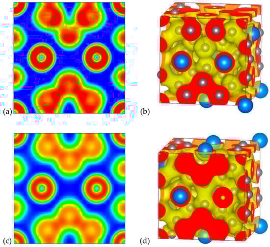 The Electron Localization Function (ELF) was introduced by Becke and Edgcombe [34] in 1990 to provide additional insight into the nature of bonding between atoms and the charge distribution in the system. It is a dimensionless indicator of the localization of electrons, correlated to the probability density of a same-spin electron pair, and ranges from 0 to 1. The regions with high ELF values that are close to unity are regions of high electron localization, usually an indication of a strong covalent bond. Regions of lower ELF are regions of lower electron localization and can be found in ionic bonds. The value of 0.5 is of a free electron like delocalized gas, and lower values denote a minimal electron density concentration [35,36]. An excellent review paper on this and examples of its applications can be found in reference [37].
