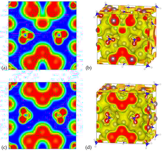 The 2D and 3D ELF plots for (NH4)8Sn44 for models A and C are illustrated in Figure 7. The 2D ELF maps shown in Figure 7a,c correspond to the same (001) plane as for Cs clathrates. Qualitatively, the obtained 2D ELF maps for the corresponding models for Cs and NH4 clathrates share the same features regarding the regions of electron localization in the neighbor of Sn atoms and the ionic character of the interaction between guest cations and the host framework (blue region around NH4 cations). High values of ELF are observed in NH4+, indicating the N-H covalent bonds existing within the guest cation. A slight distinction in the 2D ELF maps between model A for Cs and NH4 clathrates can be observed if we compare the illustrations in Figure 6a and Figure 7a. In the case of the NH4 clathrate, lower ELF values are observed in the region of the Sn vacancy, which can be attributed to the weaker ability of charge transfer from the ammonium cation with respect to Cs.