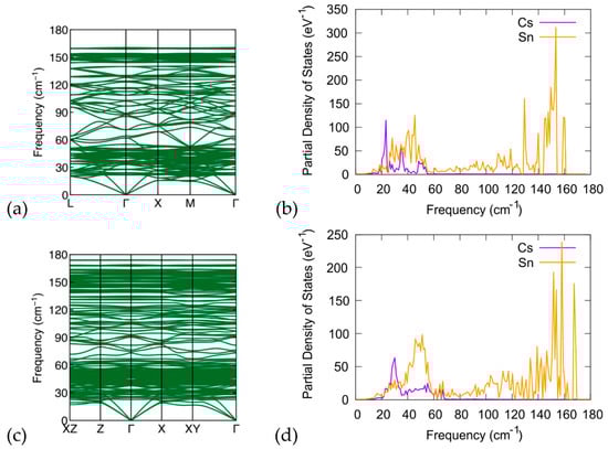 We have conducted DFT calculations to investigate the phonon properties of the examined structures. We present the phonon spectrum, including the phonon band structure and phonon density of states (pDOS) of Cs8Sn46−x (x = 0, 2). In Figure 8, we present the calculations for the phonon band structure and phonon DOS of the Cs8Sn46 compound and compare them with the phonon band structure and phonon DOS of the Cs8Sn44 structure (model C). The phonon bands are in good agreement with previous experimental and computational studies [22,44,45]. Additionally, we investigate the theoretical properties of the proposed (NH4)8Sn44 compound. The absence of imaginary frequencies in the phonon band structure confirms that the investigated materials are dynamically stable at 0 K. In the case of Cs8Sn46 (Figure 8a,b), we observe that several flat bands are introduced both in the acoustic and optical regions of the band structure, and that these are in good agreement with previous computational and experimental findings. As can be seen in pDOS plot, three distinct phonon bands resulting from Cs appear at 23 cm−1, 35 cm−1, and 50 cm−1, which can be attributed to the phonon modes of Cs atoms in the two different Sn cages of the material. It can be also seen that there are two regions with high density of states located above the acoustic modes and another near the top of the optical modes. For Cs8Sn44 (Figure 8c,d), the overall appearance of the phonon band structure and the pDOS are quite similar to the Cs8Sn46 with some distinctions. In the band structure diagram, we observe that the optical modes of Cs8Sn44 reach larger frequencies with respect to Cs8Sn46 analogue. As seen in the pDOS plot, these optical modes are related to the Sn atoms of the framework and their appearance can be attributed to the existence of three-coordinated Sn atoms in the framework. The number of localized bands in the band diagram are further increased for the same reason. For the phonon modes related to the Cs atoms, we can observe a shift of the low frequency peak in higher frequencies and a broadening of the two peaks in the region of 30 cm−1 to 60 cm−1 owing to the small distortions of the Sn cages and the reduction of framework symmetry due to the creation of Sn vacancies.