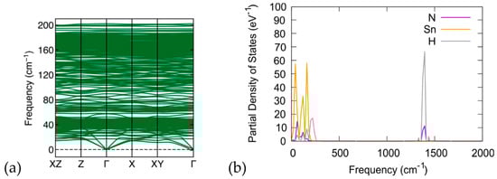(a) Calculated phonon band structure along the ΧΖ-Ζ-Γ-X-XY-Γ path and (b) partial phonon density of states for N, H, and Sn atoms for the (NH4)8Sn44 (model C).