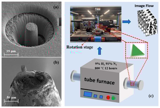 Schematic diagram of the experimental procedure. (a) Microcylinder milled by Fib; (b) Microcylinder Pt-welded to a polished flat surface; (c) Sample reduction reaction and nano-CT scanning of the sample.