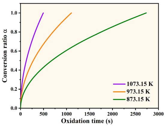 The kinetic process of nickel oxidation at elevated temperatures is divided into two main stages. At temperatures below 700 °C, the oxidation of nickel is mainly controlled by diffusion along the grain boundaries. When the temperature is elevated to 700–1000 °C, the oxidation of nickel becomes a transition state of the grain boundary and nickel lattice diffusion [31]. In addition, the shape, size, rate of heating, and oxidizing atmosphere of nickel all affect the oxidation process of nickel. However, when processing the experimental data, the oxidation rate was characterized by oxidation using traditional kinetic methods. The oxidation conversion ratio of nickel is described by Equation (3) [32], as follows: