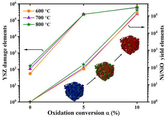 Figure 6 demonstrates the yield of nickel and damage of the 8YSZ phases at different reoxidation conversions, with the nickel phase being a criterion by the theory of maximum torsional (shearing) strain energy, and the 8YSZ phase being determined to be damaged through the maximum tensile stress theory. Within the RVE, the red portions represent the areas that might be damaged and yielded. It can be noticed that the red areas increase significantly as the degree of oxidation increases and develops from the initial sharp and thin necks to the main contact surfaces. Under normal operating conditions, the Ni-8YSZ microstructure suffers thermal stress. In this case, the nickel phase was sufficiently safe, whereas 54, 106, and 160 elements in the 8YSZ phase were damaged at operating temperatures of 600, 700, and 800 °C, respectively. These elements are concentrated in the thin necks and the relatively sharp contact surfaces of the two phases. At the 5% oxidation stage, when the von Mises stress in the nickel has approached the critical criterion, the yielded elements in the nickel are 83, 97, and 150, respectively. Meanwhile, 16.17% of the elements in the 8YSZ have been damaged, which indicates that microcracks might have already occurred in portions of the skeleton. When the degree of oxidation reaches 10%, 12.06–20.37% of the elements in the nickel phase have reached the yield point. A total of 41.33% of the elements in the 8YSZ phase are damaged.