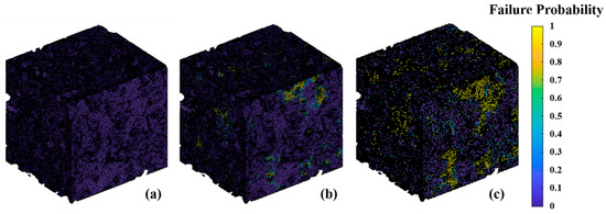 Failure probability of the 8YSZ skeleton under different reoxidation conversions. (a) Reoxidation conversion = 0; (b) Reoxidation conversion = 5%; (c) Reoxidation conversion = 10%.