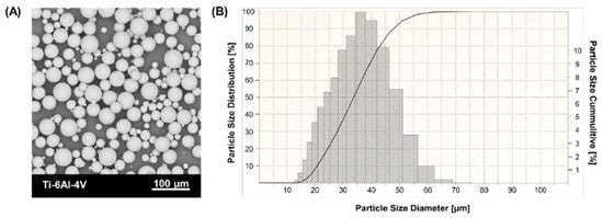 Ti-6Al-4V powder characterization: (A) morphology (SEM), (B) particle size distribution (PSD).