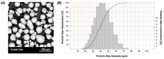 The samples were fabricated from commercial Ti-6Al-4V powder (3D Systems, Rock Hill, SC, USA) and Ti-6Al-7Nb powder (SLM Solution Group Ag, Lubeka, Germany). The chemical composition of the powders is shown in Table 1. Scanning electron microscope images (Figure 1A and Figure 2A) show spherical grain morphology with satellite characteristics for powders produced by gas atomization technology. The particle size distribution of the powder (Figure 1B and Figure 2B) was determined using an ANALYSETTE 22 MicroTec Plus laser particle size analyzer (Fritsch GmbH, Amberg, Germany) and presented according to PN-ISO 9276-1 [].