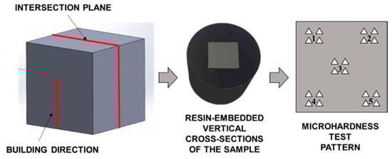 The microhardness tests were conducted using the FISCHERSCOPE HM2000 microhardness tester (Helmut Fischer GmbH, Sindelfingen, Germany) with a test load of F = 0.05 N. The cross-sections of randomly selected specimens were embedded in resin, and the surfaces to be measured were prepared according to the methodology presented. To analyze local hardness values, measurements were carried out for 5 areas of the cross-section. For each area, 4 measurement points were determined, approximately 150 µm apart, as shown in Figure 3.