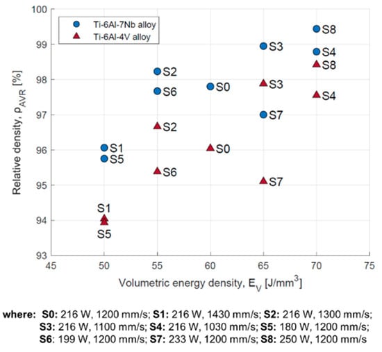 Relative density dependent on volumetric energy density for Ti-6Al-4V and Ti-6Al-7Nb alloys.