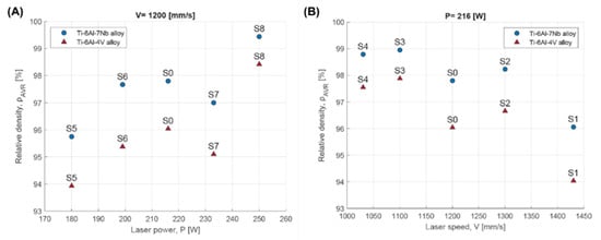 Relative density dependent on: (A) laser power; (B) scanning speed for Ti-6Al-4V and Ti-6Al-7Nb alloys.