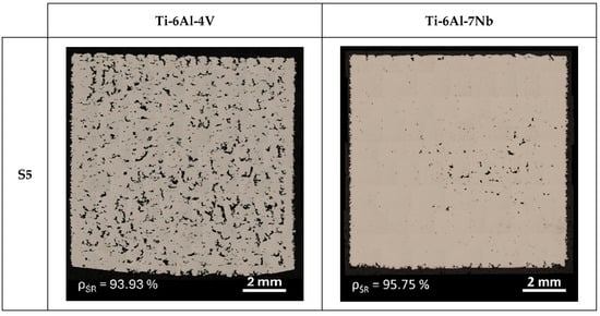 Mosaics of vertical cross-section of Ti-6Al-4V and Ti-6Al-7Nb samples with the lowest (S5) value of relative density.