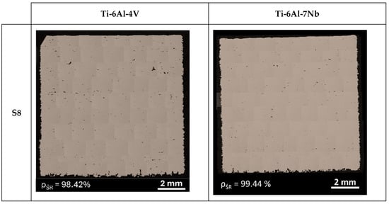 Mosaics of vertical cross-section of Ti-6Al-4V and Ti-6Al-7Nb samples with the highest (S8) value of relative density.