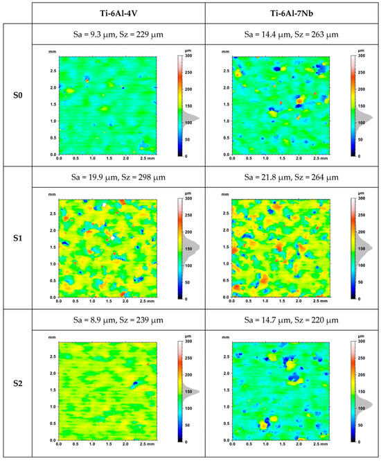 Sa and Sz values for the upper surfaces of Ti-6Al-4V and Ti-6Al-7Nb samples.