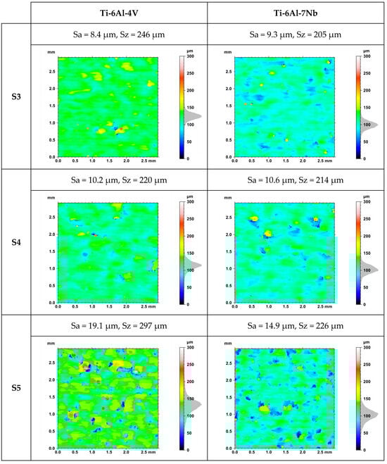 Figure 8 presents images of the topography of the upper surface of a sample randomly selected from each series for Ti-6Al-4V and Ti-6Al-7Nb alloys. Differences in roughness parameter values were observed for samples produced using the same manufacturing strategy, which is related to the variable orientation of the position. This is further evidence of the importance of considering the spatial orientation of individual planes in the context of their surface quality.