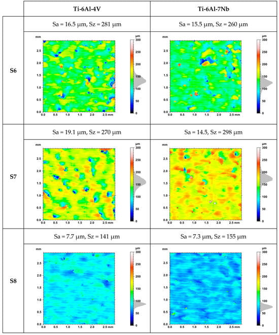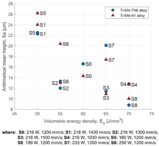 Table 4 shows the evaluation of surface roughness based on the values of Sa and Sz parameters (averages of three measurements). A reduction in surface roughness was obtained as the results of an increase in the value of volumetric energy density (Figure 9). The lowest average value of the Sa was observed for strategy S8. This was, respectively, 10.0 ± 3.6 μm for the Ti-6Al-4V alloy and 8.8 ± 2.0 μm for the Ti-6Al-7Nb alloy.
