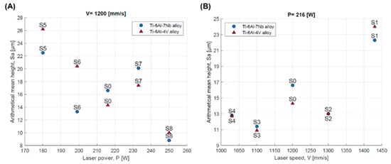 Surface roughness defined by the parameter Sa depending on: (A) laser power; (B) scanning speed for the Ti-6Al-4V and Ti-6Al-7Nb alloys.
