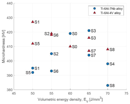 Microhardness of core area depending on volumetric energy density for Ti-6Al-4V and Ti-6Al-7Nb alloys.
