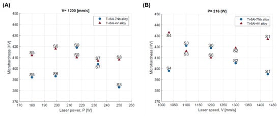 Microhardness of core area depending on: (A) laser power; (B) scanning speed for Ti-6Al-4V and Ti-6Al-7Nb alloys.