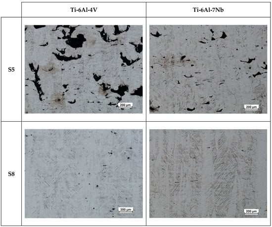The porosity of a material’s internal structure is a determinant of the relative density. Figure 6 and Figure 7 show a mosaic of metallographic images for the vertical cross-section of samples with the lowest (S5) and highest (S8) relative densities for the Ti-6Al-4V and Ti-6Al-7Nb alloys. In the samples with the lowest relative density, pores with irregular and elongated shapes were observed, which can be classified as “lack-of-fusion” defects. The pores are arranged according to the direction of layer formation, and partially fused powder grains can be observed in some of them.