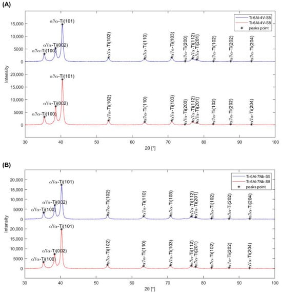 X-ray diffraction spectrums of (A) Ti-6Al-4V and (B) Ti-6Al-7Nb alloys manufactured according to strategies S5 and S8.