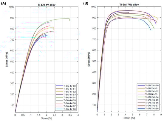Stress–strain curve of (A) Ti-6Al-4V and (B) Ti-6Al-7Nb samples.