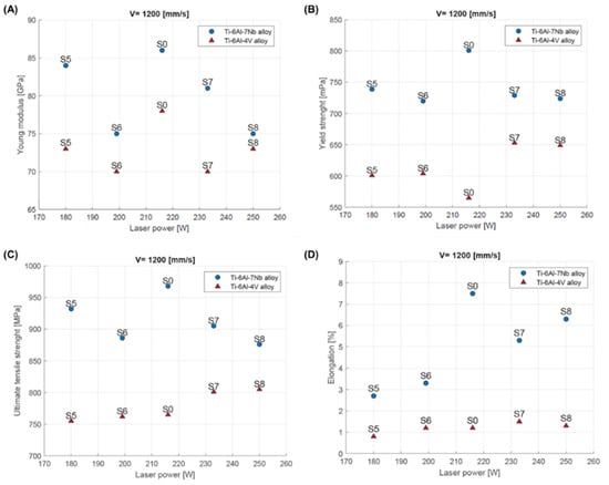 Mechanical properties of Ti-6Al-4V and Ti-6Al-7Nb depending on laser power: (A) Young’s modulus; (B) yield strength; (C) tensile strength (Rm); (D) elongation.
