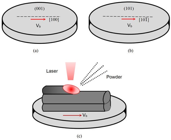 Schematic illustrations of the specimens with substrate orientations of (a) (001)/[100], (b) (101)/[10]; and (c) laser metal deposition process.