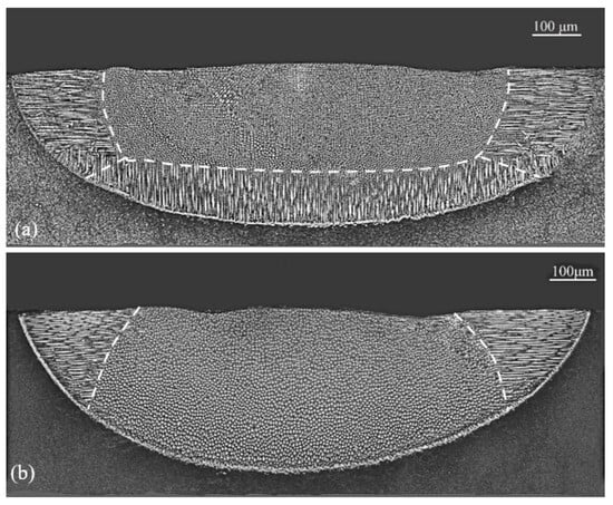 Transverse section microstructures of specimens with substrate orientation of (a) (001)/[100] and (b) (101)/[10] under laser LR conditions of a power of 250 W and a laser scanning velocity of 5 mm/s.