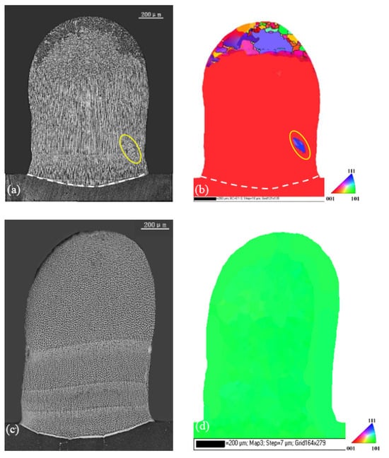 If the z-step varied from 100 to 300 μm, the optical micrographs and the corresponding EBSD maps of the specimens in transverse section for the two substrates are given in Figure 6, where four layers are deposited with the final dimensions of 1.5 mm height and 0.8 mm width. For substrate A, it can be seen that a stray grain formed in the center part of the weld pool, as indicated by the yellow circle in Figure 6a,b. Due to the larger layer step, this stray grain was not remelted in the later treatment and grew continuously from the first trace to the second one. In the upper part of the sample, more stray grains appeared due to CET near the surface. Clearly, for this substrate, the increase in the layer step induced the stray grain formation. However, for the substrate B, although the layer step increased to 300 μm, the whole deposited part still maintained ideal single crystallinity, as shown in Figure 6c,d.